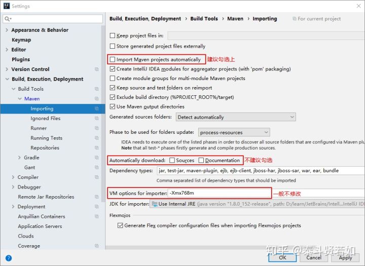 不建议勾选,原因是这样可以加快项目从外网导入依赖包的速度,如果我们需要源码和文档的时候我们到时候再针对某个依赖包进行联网下载即可。IntelliJ IDEA 支持直接从公网下载源码和文档的。 - VM options for importer:可以设置导入的 VM 参数。