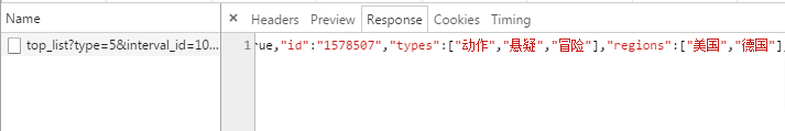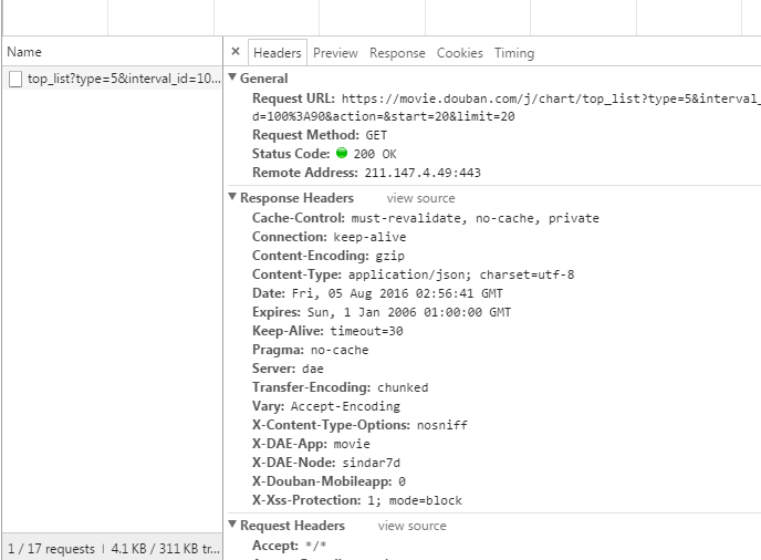 查看一下RequestURL信息,我们可以发现在action参数之后又跟了两个参数"start"和"limit",很显然它们的意思是:"从某个位置开始返回的电影的个数"。