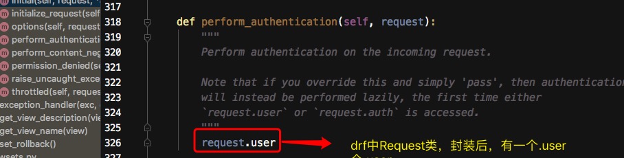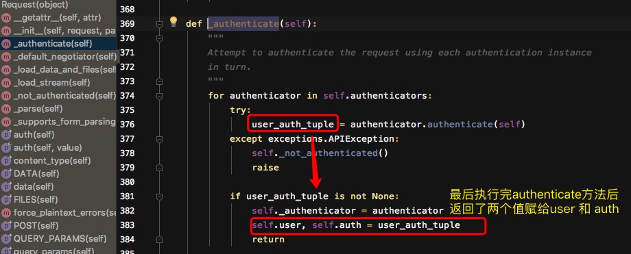 - 去request类里找user方法,被包装成了属性,里面执行了一个方法,self._authticate方法