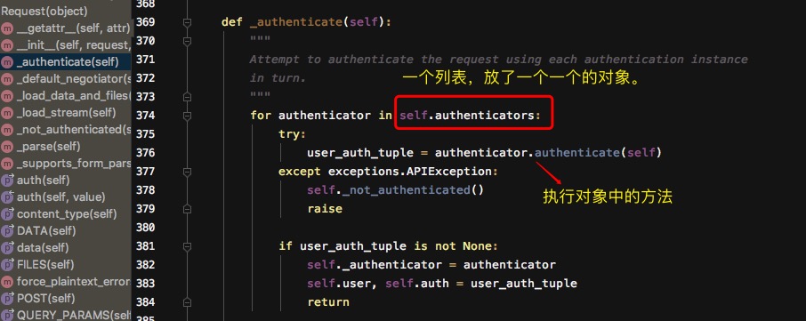 - self._authticate方法里从自己的authenticators一个一个的取东西,authenticators