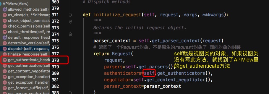 - 到dispatch里找初始化的时候,也就是APIView的initialize_request方法传了self.authenticators,里面是一个get_authenticators的方法