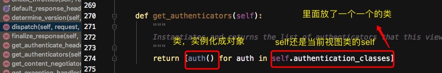 - self.authentication_classes 是[类1,类2,类3]一个一个取,加括号执行。生成一个一个对象.最后返回到前面的Request的_authenticate方法