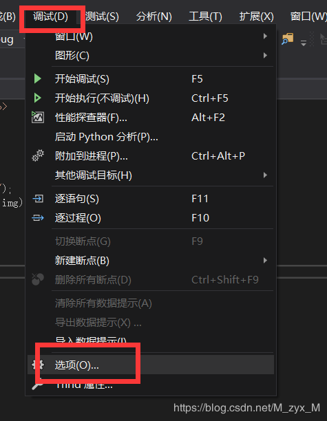 在菜单栏的调试中选择选项。
