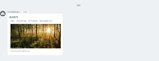 "text": "#### 杭州天气 \n > 9度, 西北风1级,空气良89,相对温度73%\n\n > ![screenshot](http://i01.lw.aliimg.com/media/lALPBbCc1ZhJGIvNAkzNBLA_1200_588.png)\n > ###### 10点20分发布 [天气](http://www.thinkpage.cn/) test"