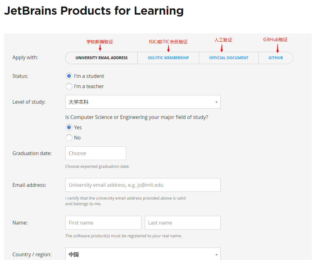 根据图片中的注释完成学生认证的申请既可以,注意学生证的照片要拍清晰,可以上传不止一张照片。填写的电子邮箱也将是以后JetBrains的账号。