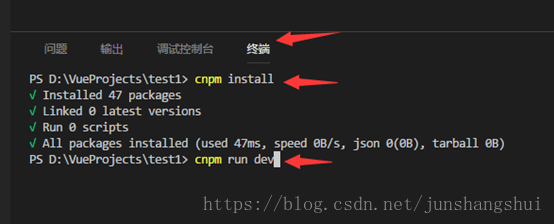 在终端输入cnpm install先检查和下载依赖,然后输入cnpm run dev运行项目,如下图