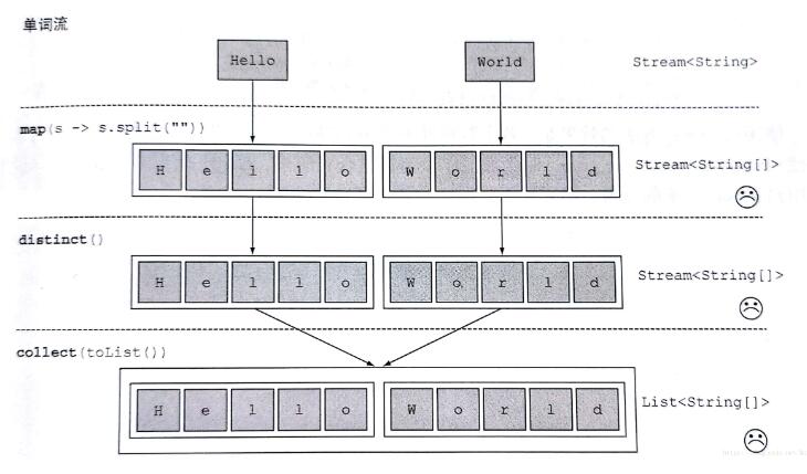 这个实现方式是由问题的,传递给map方法的lambda为每个单词生成了一个String[](String列表)。因此,map返回的流实际上是Stream<String[]> 类型的。你真正想要的是用Stream<String>来表示一个字符串。
