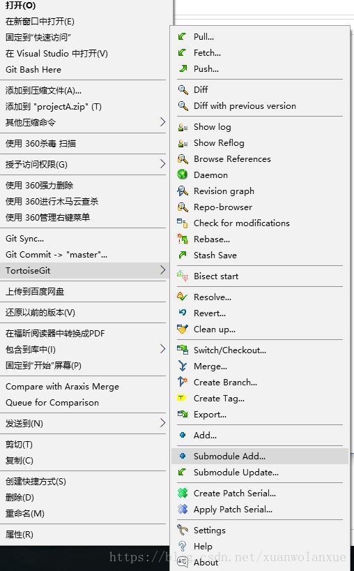 如果是使用tortoisegit的话,也可以使用图形化界面进行submodule的相关操作,如添加submodule就选择如下图所示的菜单: