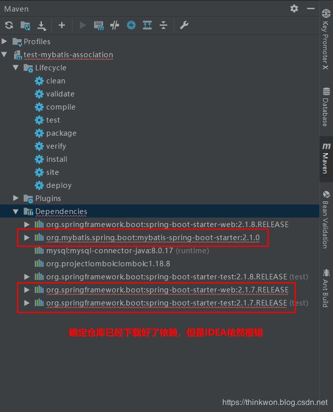 • 把pom.xml中对应的依赖先删除,然后刷新右侧,之后再把依赖粘贴到pom.xml中,再次刷新右侧就好了