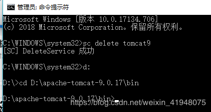 3.以管理员身份运行cmd,执行命令sc delete tomcat9(我之前装的tomcat版本是tomcat89.0.17,根据你自己的版本决定),删除tomcat service