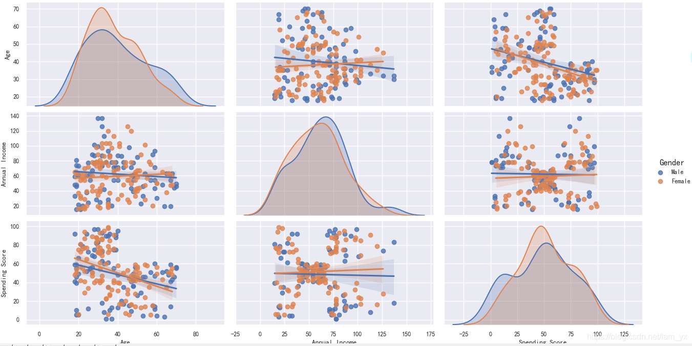 如下图。从上到下分别是年龄、年收入和消费能力的柱状图。发现: