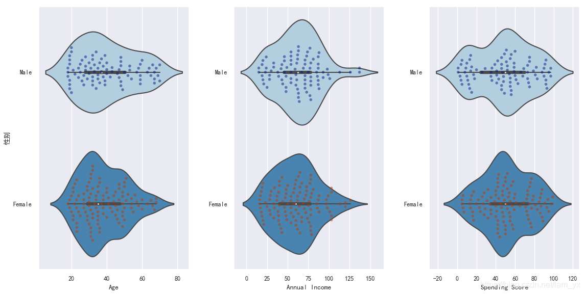 如下图。从左到右分别是年龄、年收入和消费能力的分布情况。发现: