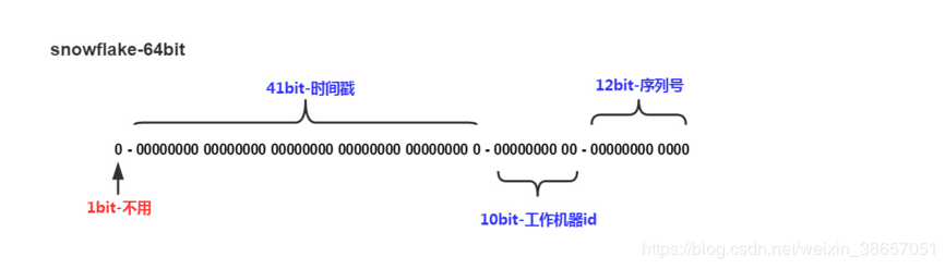 第一位为未使用,接下来的41位为毫秒级时间(41位的长度可以使用69年),然后是5位datacenterId和5位workerId(10位的长度最多支持部署1024个节点) ,最后12位是毫秒内的计数(12位的计数顺序号支持每个节点每毫秒产生4096个ID序号)