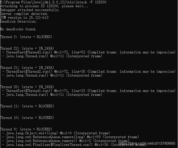 可以用jdk自带的jstack来看看线程的状态,在windows系统中可以打开cmd然后进入jdk所在目录,然后执行Jsp,能查看到各线程id,然后执行jstack -F pid就可以看的状态了