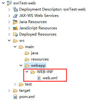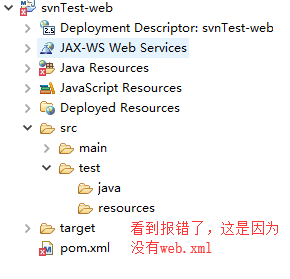 解决此报错很简单,添加一个web.xml就可以了,右键【svnTest-web】-【javeEE tools】-【generate deployment descriptor stub】,可看到不报错了,如下: