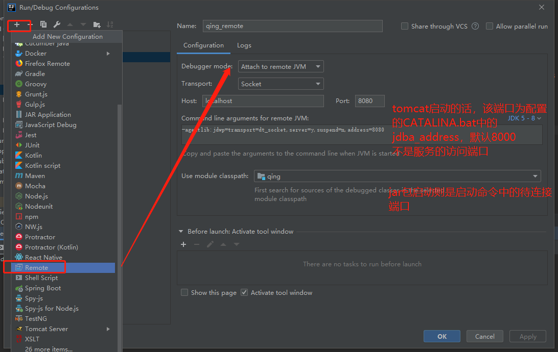 启动命令:java -Xdebug -Xrunjdwp:transport=dt_socket,server=y,suspend=y,address=8080 -jar qing.jar