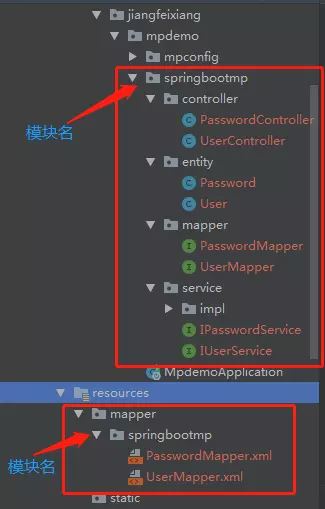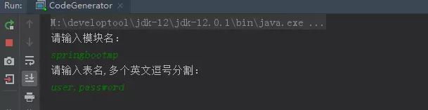 我的模块名是springbootmp,因为我有两张表,输入两个表的名称回车即可生成对应的代码,所生成的代码在模块名springbootmp下