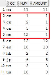 11条记录经group by后为10条,其中cc='cn' and item='8.1.1'对应的两条记录的num汇总成值3.