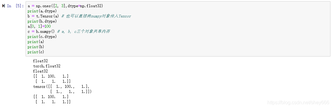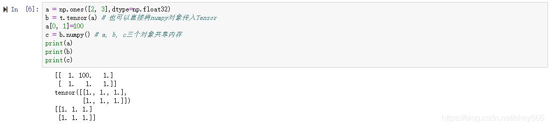 t.from_numpy()或者t.detach()将Numpy转为Tensor,与原Numpy数据共享内存。