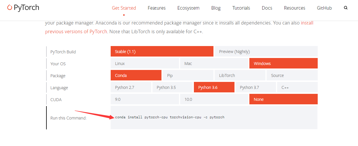 按照网上的一些相关说法,可以去pytorch官网查看anaconda下载的相关代码。pytorch官网