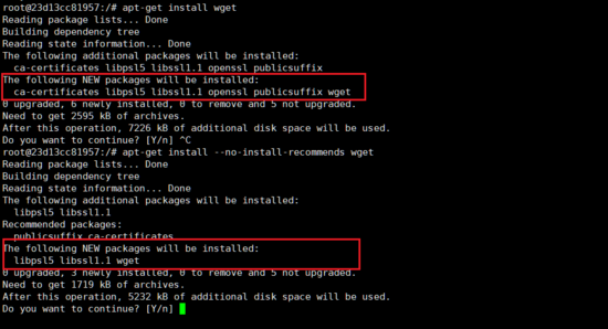 我们以apt为例,apt-get在安装软件的时候,可以指定一个选项: --no-install-recommends ,指定这个参数后,有一些非必须的依赖将不会被一起安装。比如,我们安装wget时,如果增加这个选项,待安装的包将从6个减少为3个: