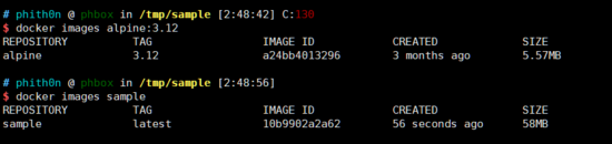 相比起来,正常的alpine:3.12只有5.57MB,说明即使我们已经删除了 /sample.dat 文件,在最后的镜像中也没有这个内容,但是它永远留在了镜像的history中。
