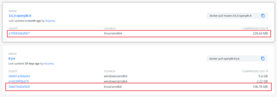 以最常见的Java项目为例,编译Jar包的时候,我们需要使用到JDK、Maven等工具,但在实际运行阶段,我们只需要JRE环境即可。简单比较下 maven:3-openjdk-8openjdk:8-jre 两个镜像的大小: