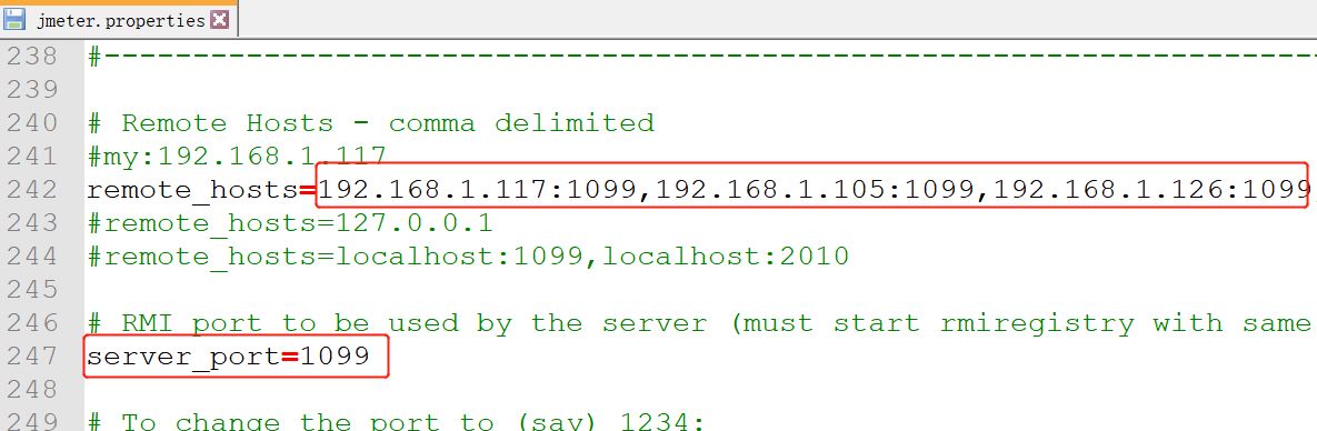 - 在主控机的jmeter的bin目录找到配置文件jmeter.properties。找到里面的remote_hosts 部分,修改内容为:remote_hosts=xx,xx代表的是压力机的ip:port。如果是多个压力机,之间使用【,】分隔