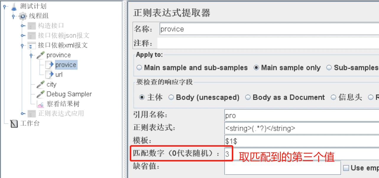 - 正则表达式:提取内容的正则表达式,相当于 loadrunner 中的关联函数