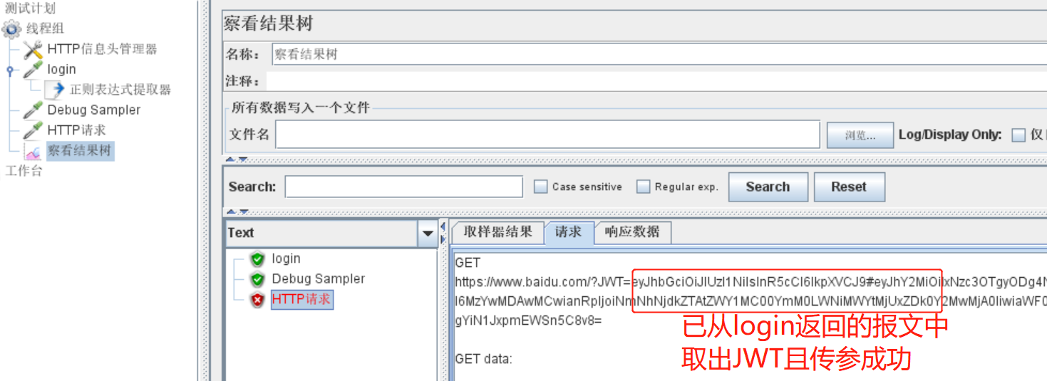 - 想要知道正则表达式是否正确,可以在请求后加入调试取样器(右键-添加-取样器-调试取样器 debug sampler)