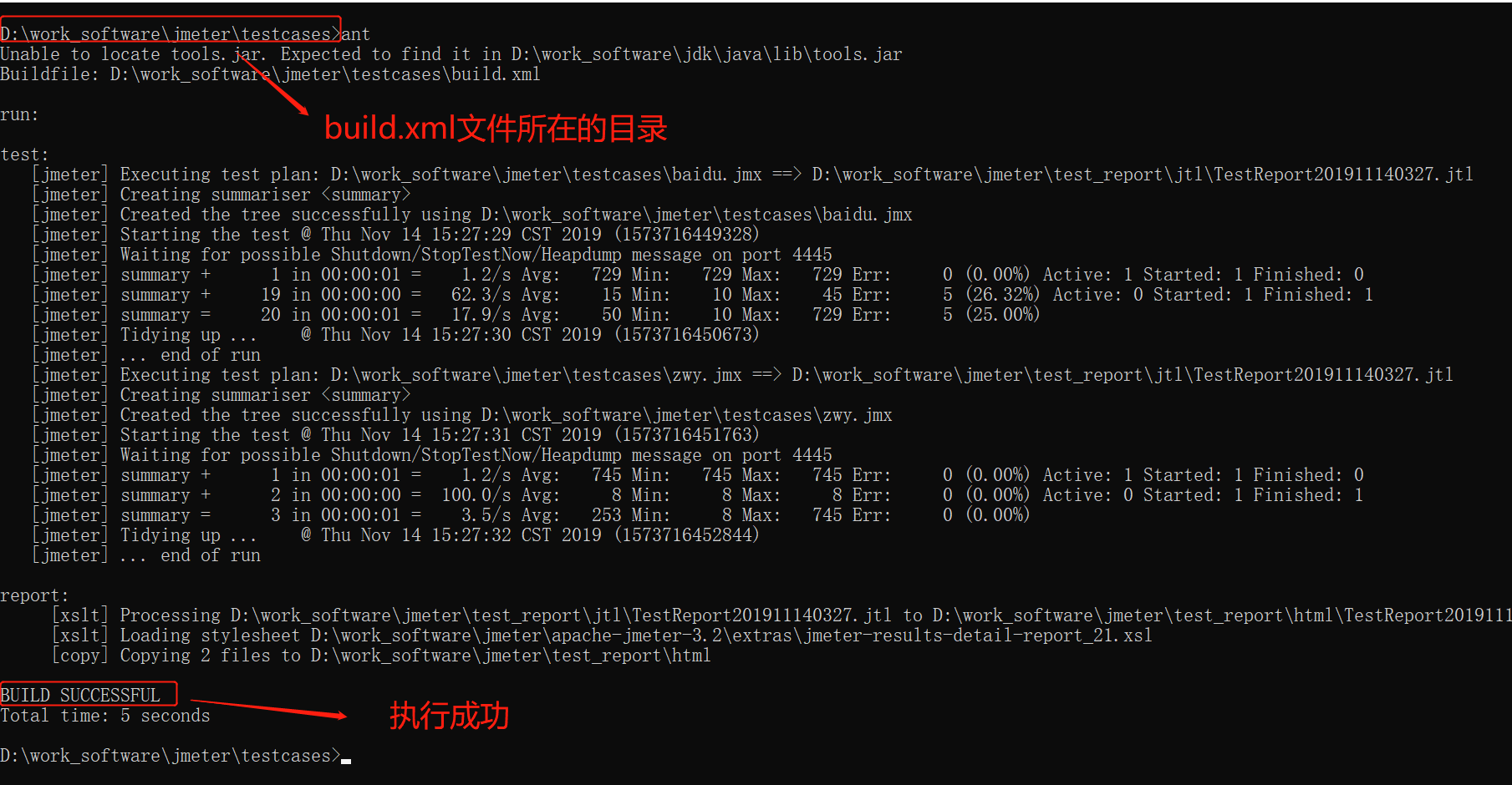 5、运行脚本,从 dos 命令下进入到上面新建的 build.xml 文件所在的目录中,输入 ant 执行 Jmeter 脚本,出现 BUILD SUCCESSFUL 则执行成功
