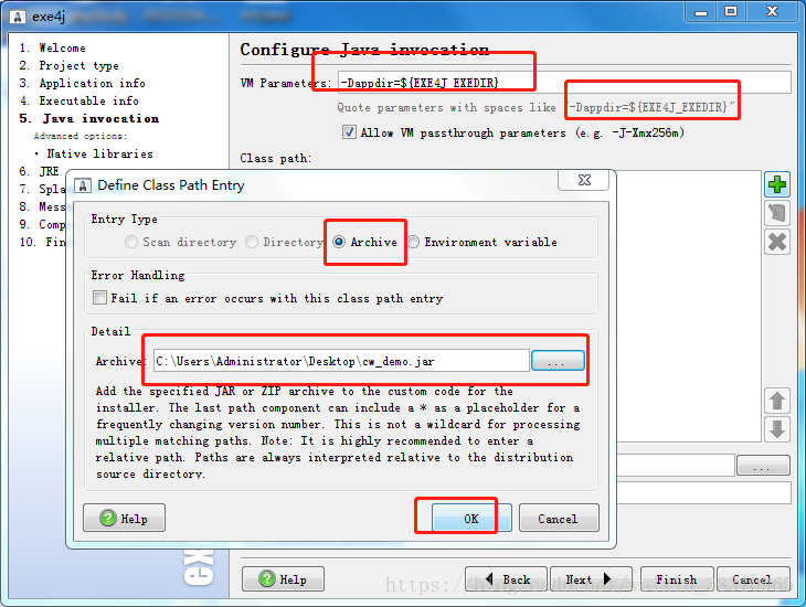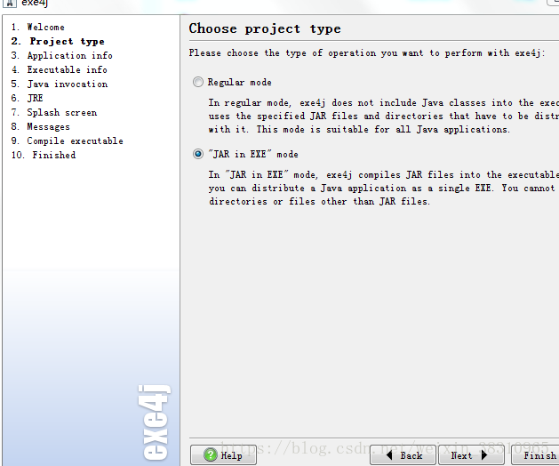4.选择“JAR in EXE” mode 单选按钮;next。