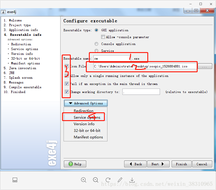 6. 图片上1为exe的名称,2为ico后缀的图片,不要自行修改后缀名,这样不起作用,去网上下载个。3全选,4选择service options,里面有项配置操作位数的,各位老爷根据自己情况选择,其他的一路next。next