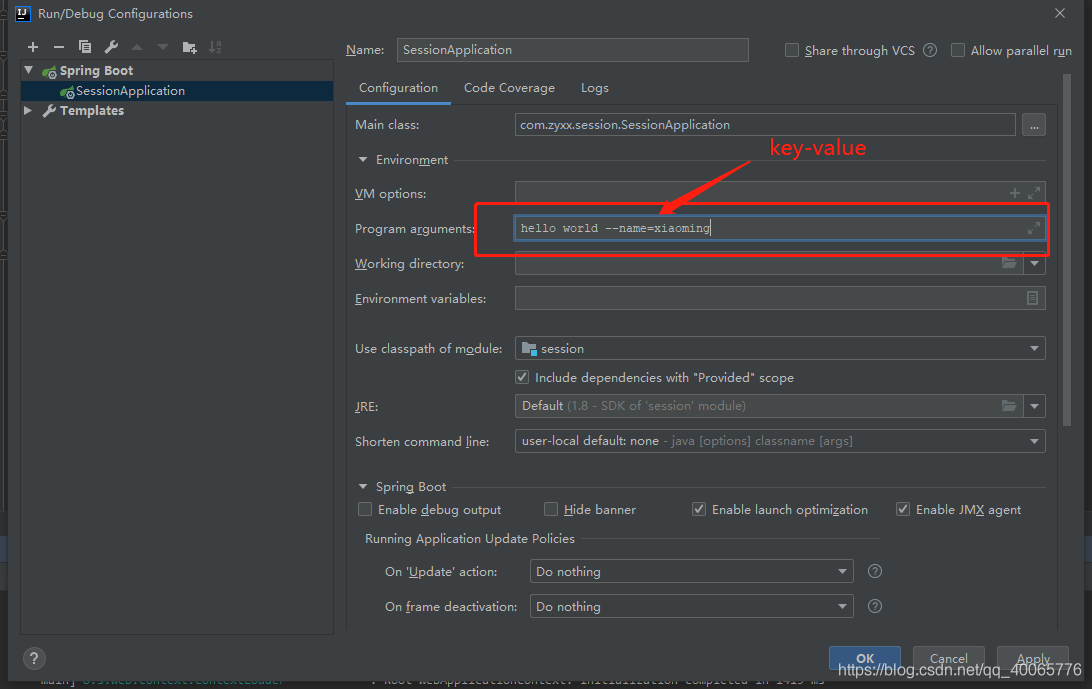 ApplicationRunner 与 CommandLineRunner 的用法基本一致,只是接收的参数不一样,可以接收 key-value 形式的参数,如下: