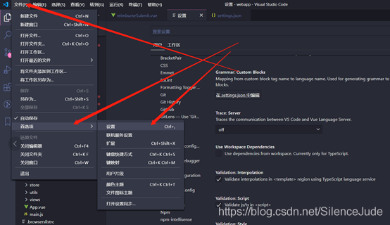 依次点击:文件——首选项——设置,在打开的页面点击,用户——拓展——vetur