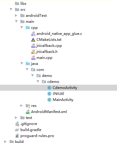 初始化是AS上的c++工程文件,这边先暂时实现简单的demo,CdemoActivity是NativeActivity的实现,我们暂时别管,因为实现是c++层控制的,有兴趣可以去百度下
