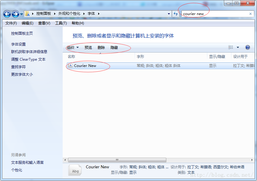 如果 这个 页面选项卡 中 没有 Courier New 字体选项,是因为 操作系统 将其隐藏了。 则在控制面板 中 找到 字体选项,将这个字体 显示 出来即可。则 其他 所有软件 都能 使用该字体了。如图: