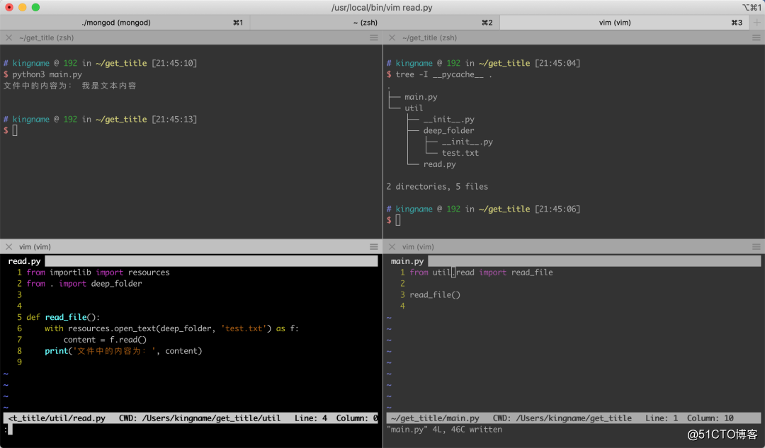 但请注意,这里我是直接运行的read.py这个文件。如果资源文件是存放在一个包(package)里面,然后我们在外面调用这个包里面的.py文件会怎么样呢?我们试一试: