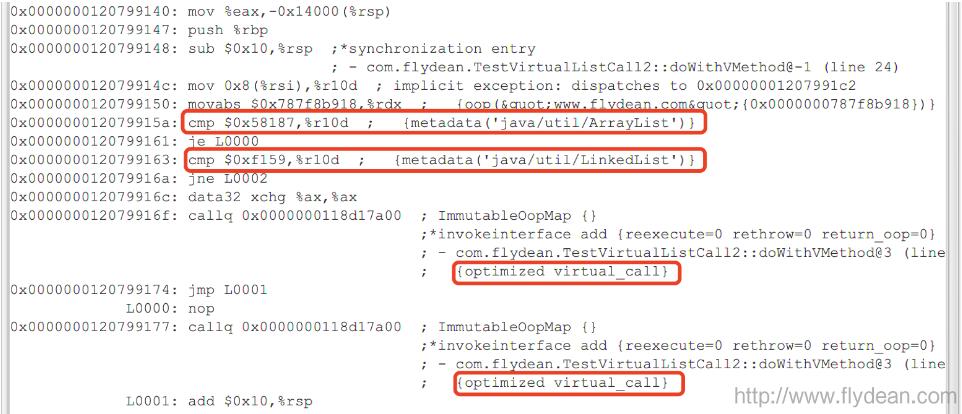 我们可以看到JIT做了两次对象类型的比较,然后对两个invokeinterface都做了优化。