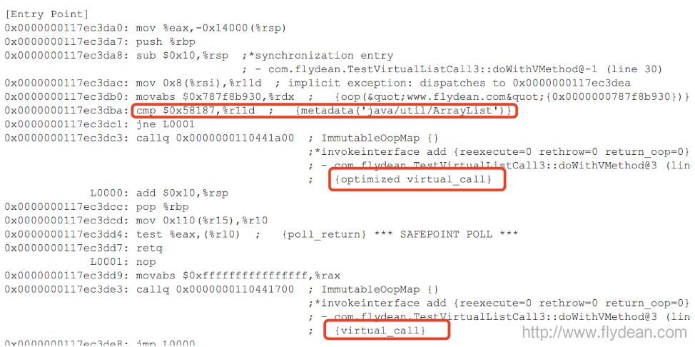 然后调用的是invokeinterface,但是其本质还是invokevirtual,并且我们可以看到这个调用是被优化过了:optimized virtual call。