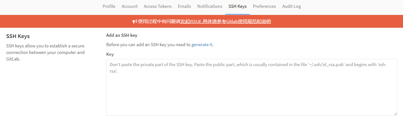 所以可以通过创建ssh key 并将产生的id_rsa.pub的内容加到gitlab的后台就可以解决问题了。