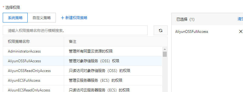 权限选择:AliyunOSSFullAccess(管理对象存储服务(OSS)权限)