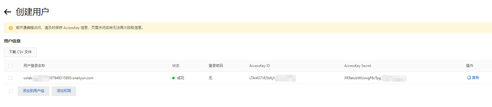此时你需要保存好AccessKeyID和AccessSecret,否则这个页面关闭后就找不到了。