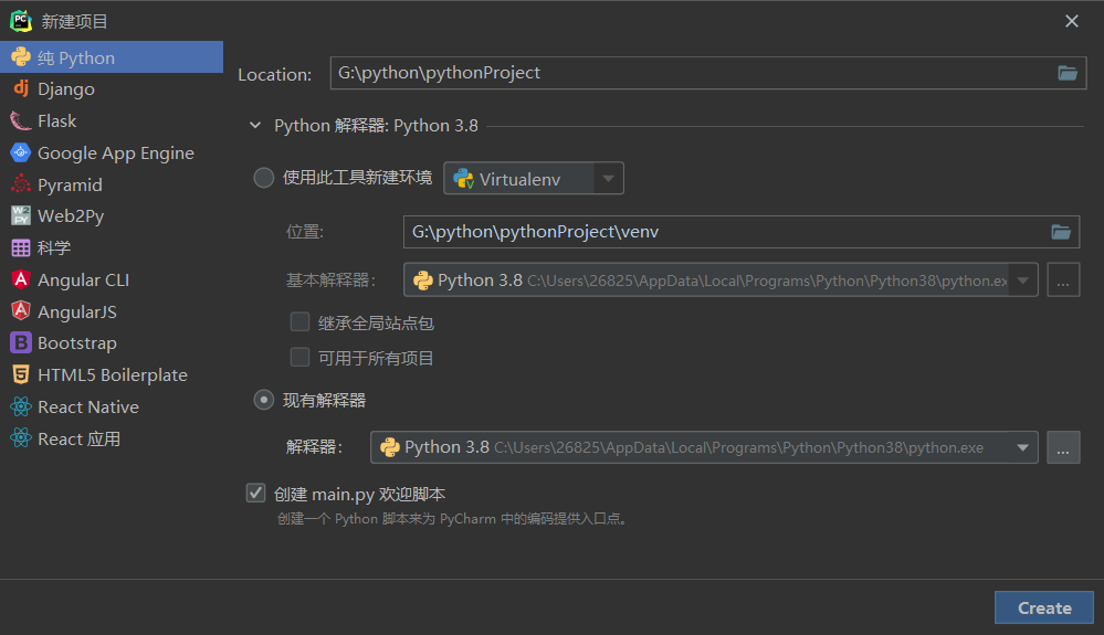新建一个项目, 如果你跟着视频学习或者运行他人项目, 就选择构建新env虚拟环境, 使用别人项目所依赖的环境