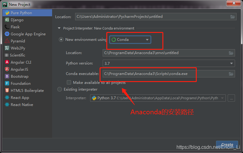 创建的时候选择 conda,一般接触python都是知道一个强大的库叫Anaconda