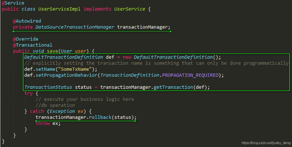 service实现类(一般不建议在接口上)上添加@Transactional,可以将整个类纳入spring事务管理,在每个业务方法执行时都会开启一个事务,不过这些事务采用相同的管理方式。