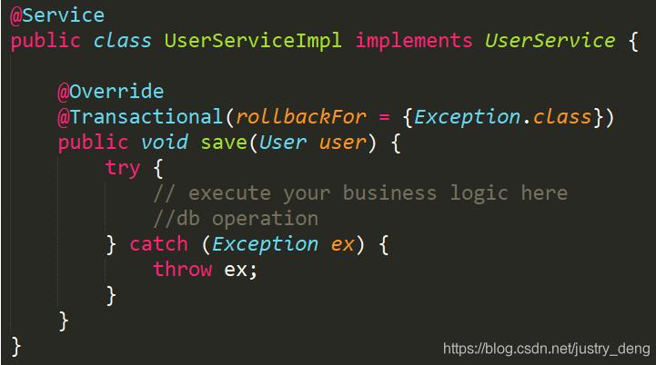注:在很多时候,我们除了catch一般的异常或自定义异常外,我们还习惯于catch住Exception异常;然后再抛出Exception异常。但是Exception异常属于非运行时异常(即:检查异常),因为默认是运行时异常时事物才进行回滚,那么这种情况下,是不会回滚的。我们可以在@Transacional注解中,通过rollbackFor = {Exception.class} 来解决这个问题。即:设置当Exception异常或Exception的所有任意子类异常时事物会进行回滚。