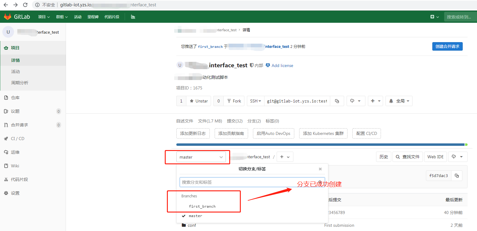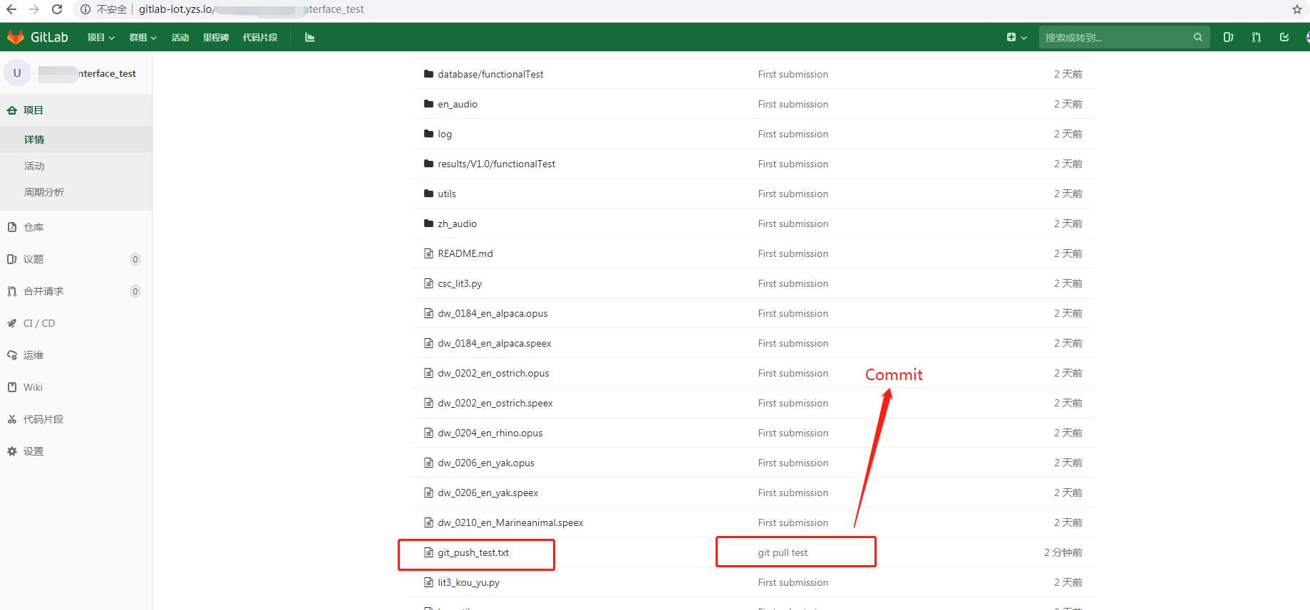 去gitlab上查看,是否增加了刚刚新增的"git_pull_test"文件
