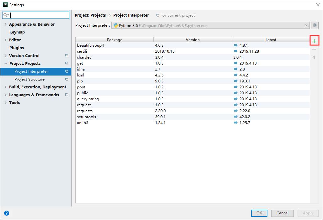 3、弹出“Settings”窗口,选择“Project: Projects”→ “Project Interpreter”,点击右侧的“+” (加号)。