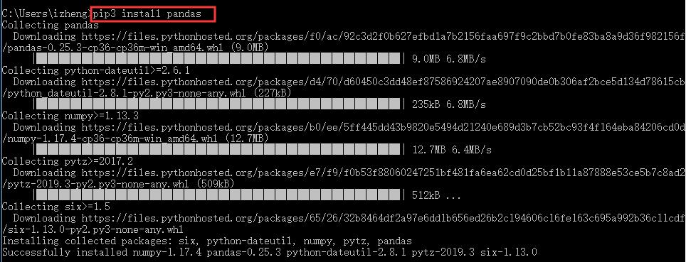 C:\Users\izheng> pip install pandas Requirement already satisfied: pandas in d:\program files (x86)\anaconda3\lib\site-packages Requirement already satisfied: python-dateutil>=2 in d:\program files (x86)\anaconda3\lib\site-packages (from pandas) Requirement already satisfied: pytz>=2011k in d:\program files (x86)\anaconda3\lib\site-packages (from pandas) Requirement already satisfied: numpy>=1.9.0 in d:\program files (x86)\anaconda3\lib\site-packages (from pandas) Requirement already satisfied: six>=1.5 in d:\program files (x86)\anaconda3\lib\site-packages (from python-dateutil>=2->pandas) You are using pip version 9.0.1, however version 19.3.1 is available. You should consider upgrading via the 'python -m pip install --upgrade pip' command.